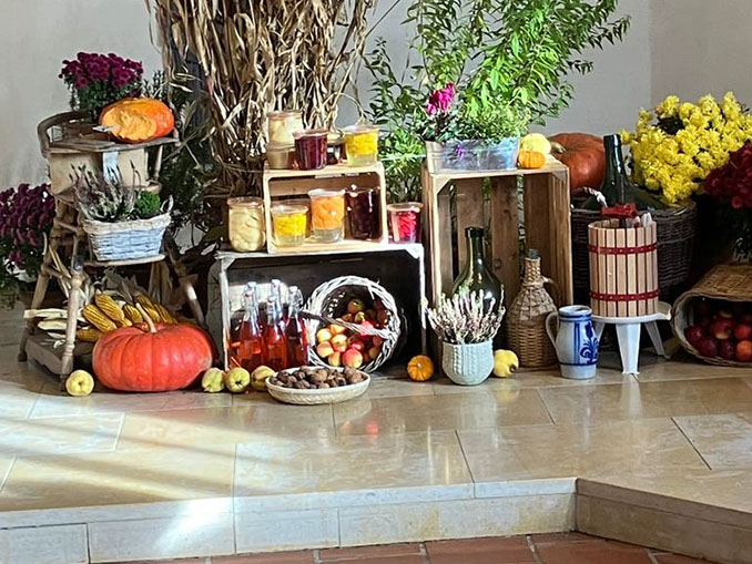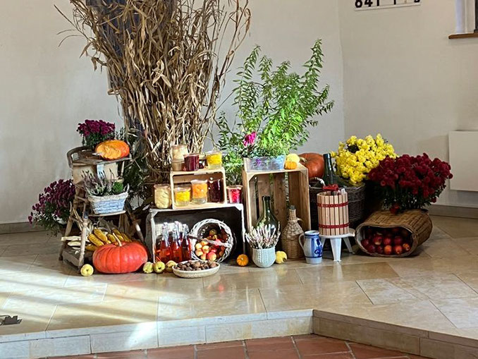 Landfrauen dekorieren die Kirche für den Erntedankgottesdienst